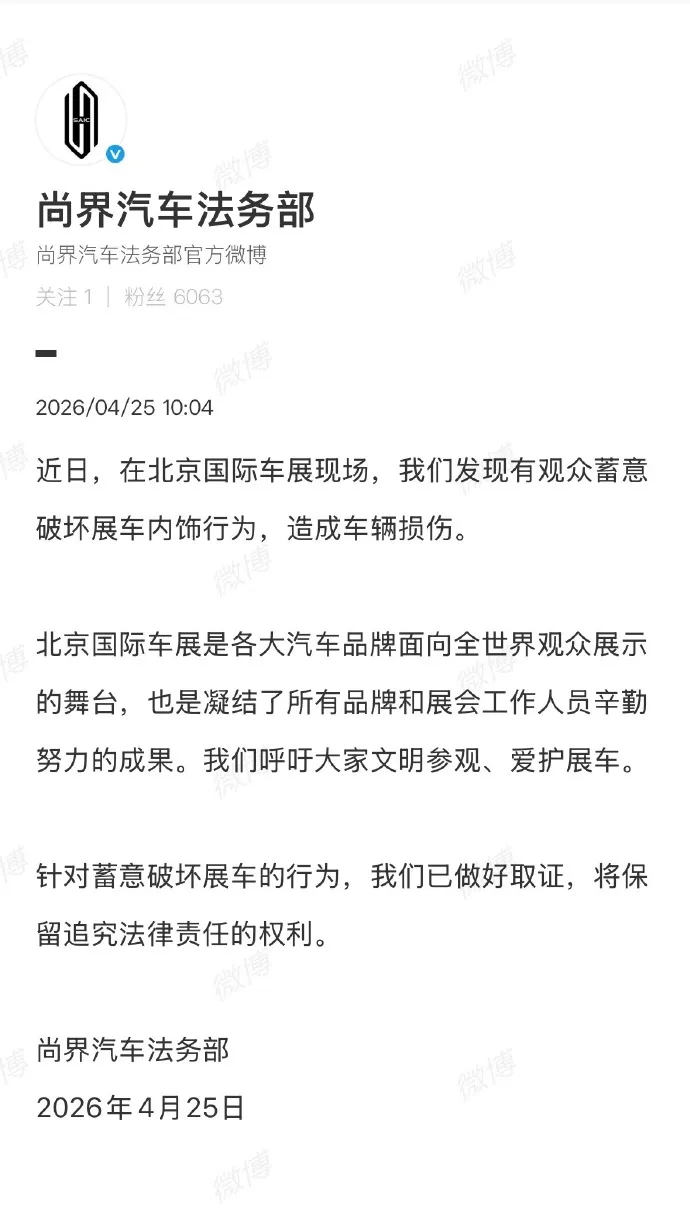 4月25日,尚界汽车法务部就北京国际车展有人蓄意破坏展车一事发文:
