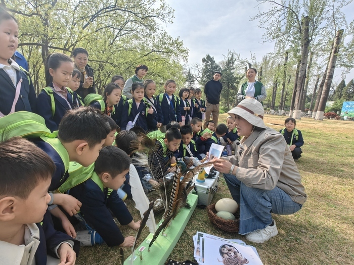 在 “嘴巴大不同” 环节,孩子们认真观察着各式鸟喙模型,纷纷说出自己的发现。专家奶奶耐心讲解,告诉大家弯钩状的鹰喙适合撕肉,扁扁的鸭嘴便于滤食水中食物,让孩子们直观了解到鸟类嘴巴与生活习性的关系。各式各样的羽毛更是让大家爱不释手,孔雀羽毛的顺滑、猫头鹰羽毛的特殊构造,都在触摸与讲解中,变成了鲜活有趣的知识。孩子们还学会了分辨不同鸟类的蛋:鸵鸟蛋硕大洁白,鸸鹋蛋碧绿如宝石,麻雀蛋小巧玲珑、带着褐色斑点。
