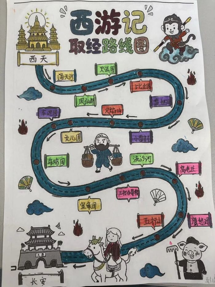 济南市槐荫区段店实验学校围绕整本书阅读,组织学生开展了创意作品制作活动。低年级学生讲述《萝卜回来了》等绘本故事;中年级学生结合寓言故事制作哲理书签,围绕科普书籍制作阅读知识卡;高年级学生梳理《西游记》主线手绘取经路线图,或以“创意朋友圈”形式再现《鲁滨逊漂流记》中的荒岛生活,将阅读与美术、设计等学科相融合。