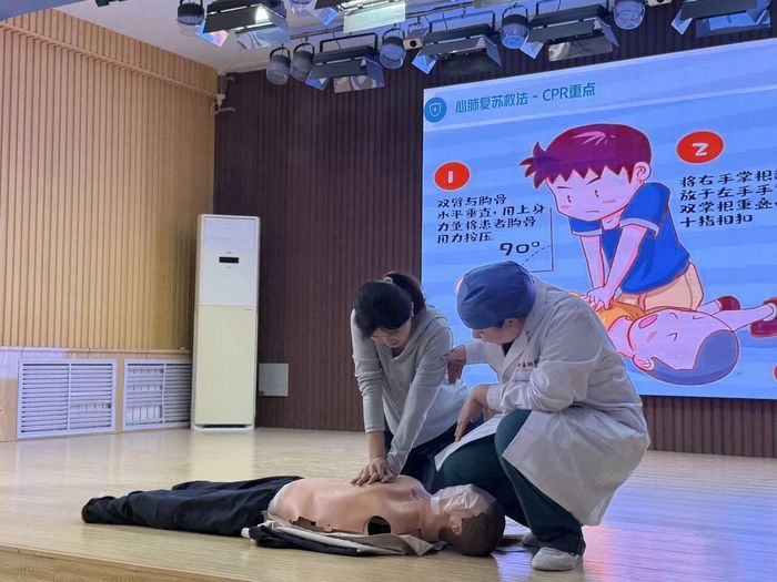 针对家长和孩子们最头疼的近视预防问题,医生们结合小学生的日常习惯,现场演示“穴位按摩操”,手把手纠正孩子们的不良用眼习惯,细致讲解科学护眼的方法,引导孩子们养成良好的用眼习惯。急救方法讲解和心肺复苏环节更是干货满满、互动感十足,医生们详细拆解操作要领,演示正确的按压姿势、力度和呼吸节奏。同学们踊跃举手,家长们也主动参与,纷纷上台尝试实操,三位医生分工指导、一对一纠正,让每一位参与者都真正掌握了紧急情况下的急救方法,切实提升了自我保护能力。