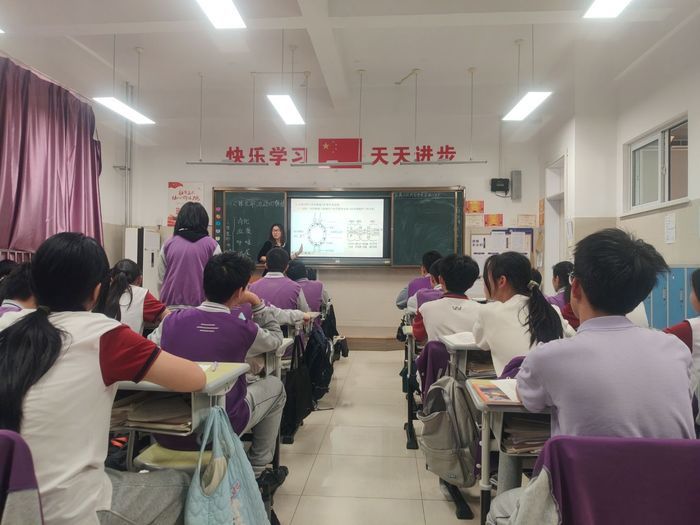 英语、生物、道法等学科同样亮点突出。七年级英语以课文的相关语境为情境主线,设置五大递进任务,整合食物词汇、名词辨析、交际句型、健康建议与倡议书写作,实现词汇、句型、语用、写作一体化复习;八年级生物以“营养—氧气—运输—排出”为主线,串联消化、呼吸、循环、泌尿四大系统,借助图表对比易错知识,结合生活情境强化应用,帮助学生构建完整的生命观念;七年级道法以“政权并立到统一”为核心主线,梳理辽宋夏金元时序脉络,运用表格归纳、地图演示等方式强化时空观念,精准突破单元重难点。每一堂课上,青年教师教态从容、设计精巧,充分发挥学生主体地位,引导学生自主梳理、合作探究、巩固提升,让复习课真正成为知识梳理的“梳理场”、能力提升的“练兵场”、素养培育的“涵养场”。