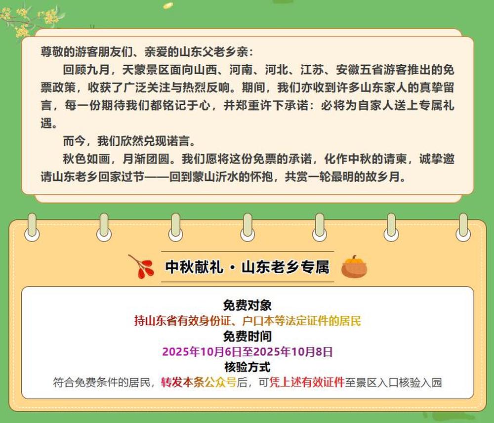 秋色如画,月渐团圆。我们愿将这份免票的承诺,化作中秋的请柬,诚挚邀请山东老乡回家过节——回到蒙山沂水的怀抱,共赏一轮最明的故乡月。