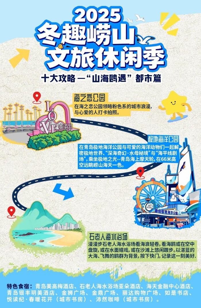 攻略以“山海鸥遇”为主题,巧妙串联都市与海洋,融合艺术打卡、海洋科普、生态互动与都市休闲等多种元素,致力于为游客呈现一个既富有活力又充满温情的冬日崂山。