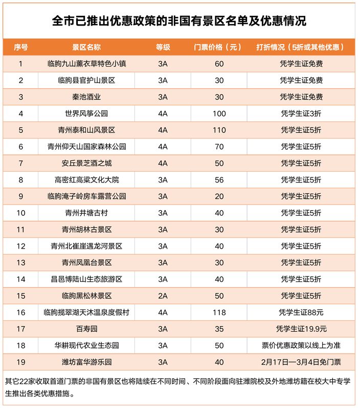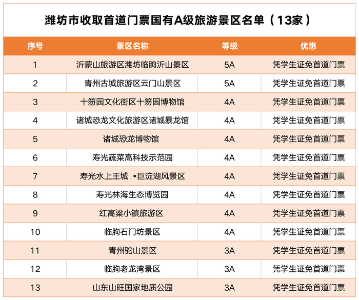 据悉,根据“2026年潍坊12件民生实事”工作部署,潍坊市文化和旅游局推出景区门票专项惠民政策,自2026年1月20日起至12月31日,对驻潍院校及外地潍坊籍在校大中专学生免收国有景区首道门票,部分重点非国有景区同步实行门票优惠,以文旅赋能青年发展,深化校地融合。