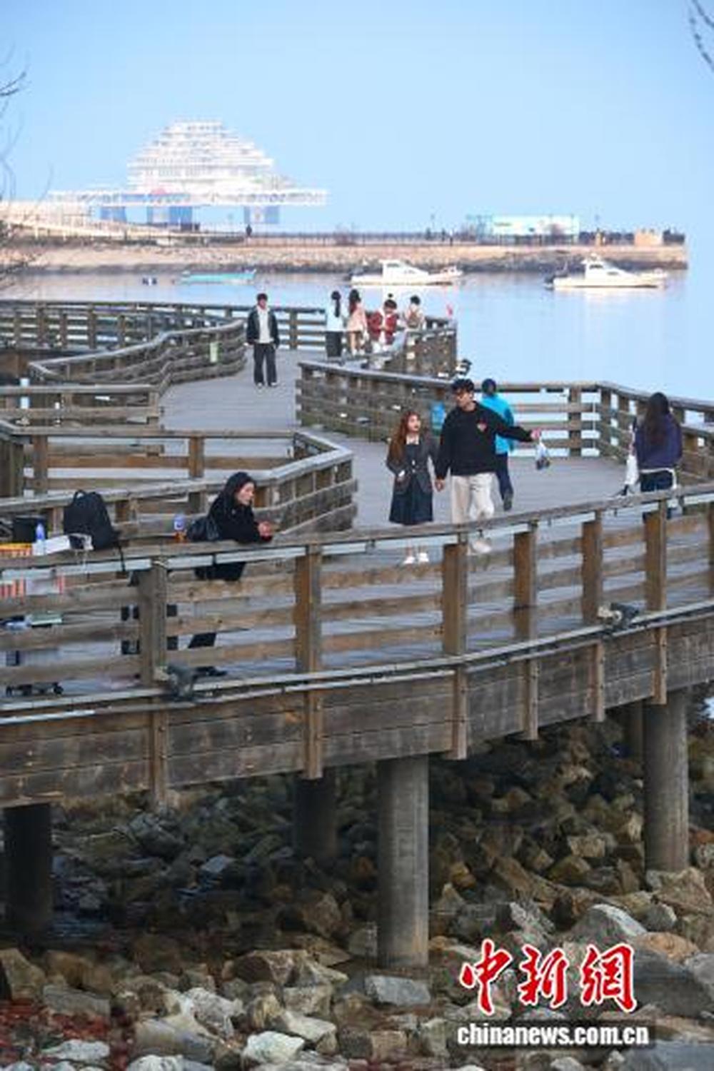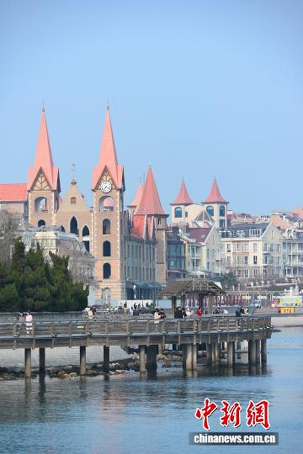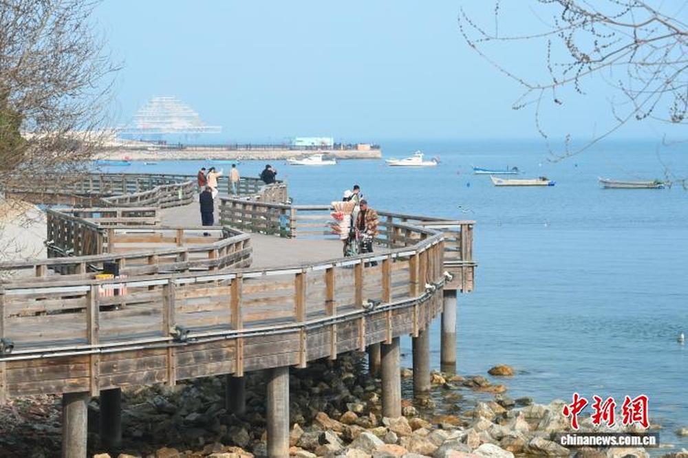 3月26日,游客在山东烟台海滨观光。持续的晴暖天气让烟台海滨景区人气渐旺,不少游客来到海边观赏美景,在碧海蓝天与和煦春光中,感受春日的浪漫气息。
