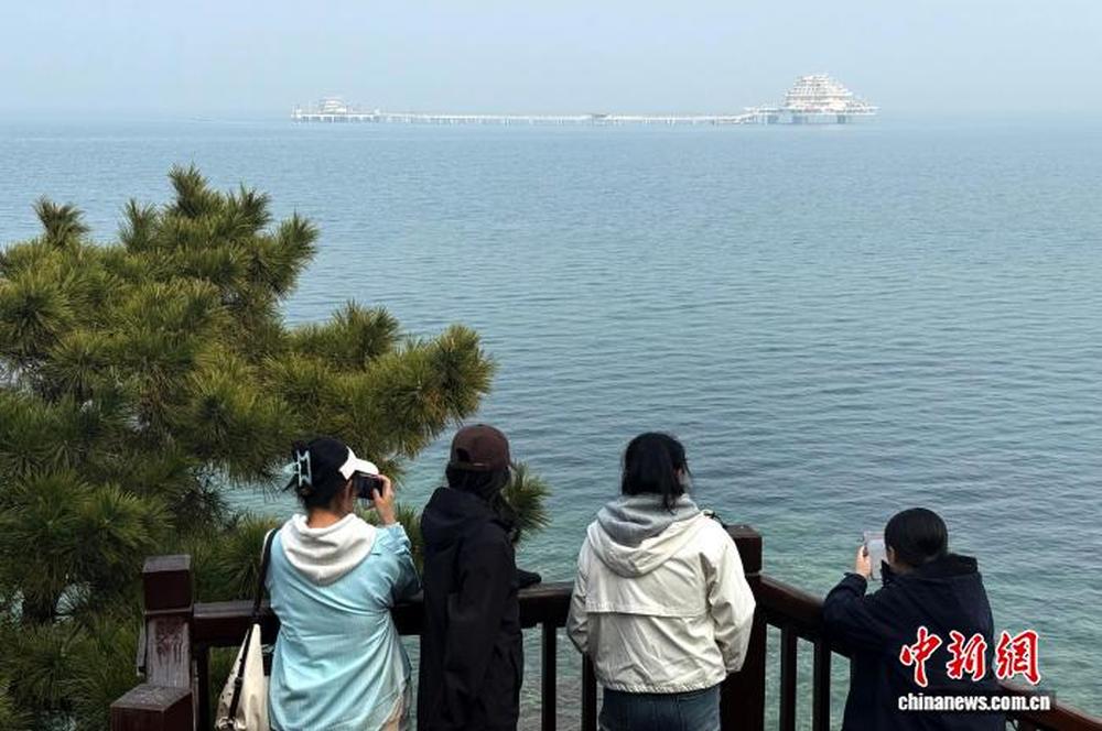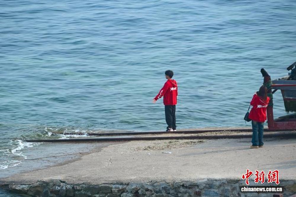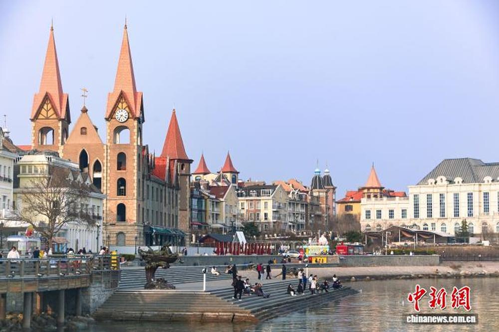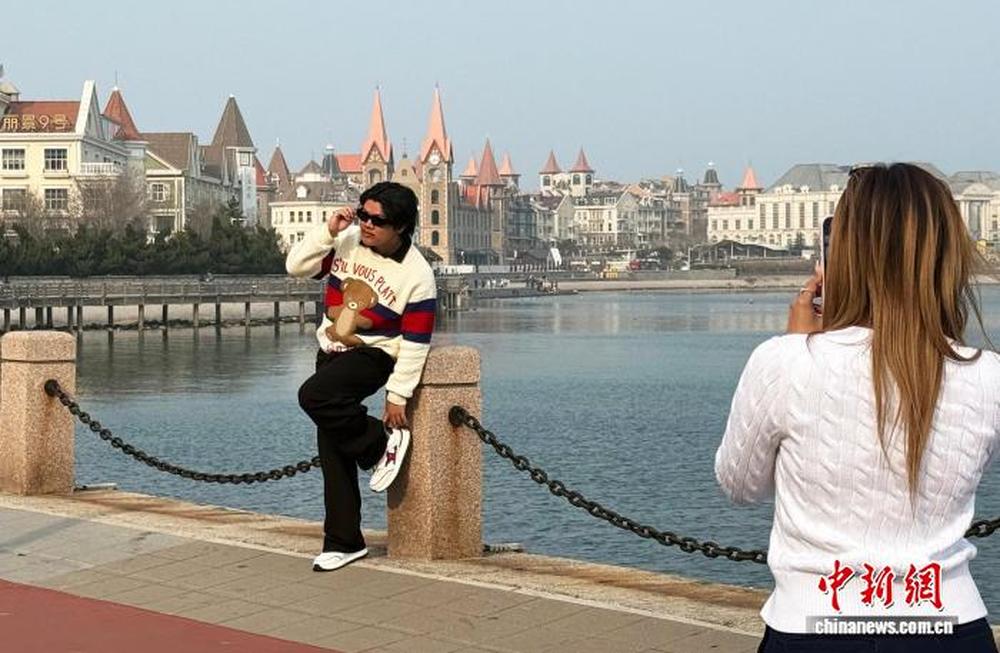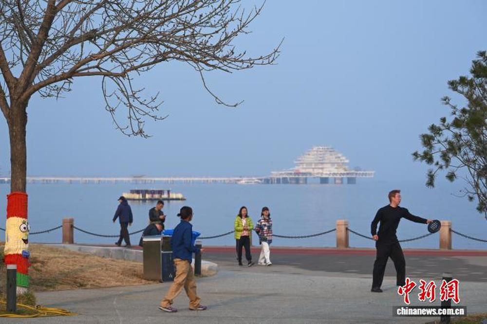 3月26日,游客在山东烟台海滨观光。持续的晴暖天气让烟台海滨景区人气渐旺,不少游客来到海边观赏美景,在碧海蓝天与和煦春光中,感受春日的浪漫气息。