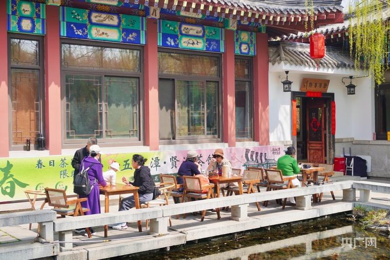 游客在公园里赏花喝茶(央广网记者 李舜 摄)