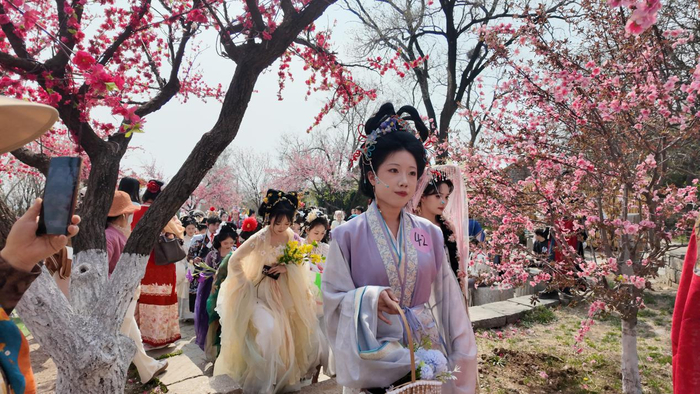 28日13时,一场盛大的国风巡游正式拉开帷幕,花神在景区内巡游互动,抚琴、起舞、送福,与游客合影。来自临沂市区的游客张女士告诉记者:“本来只是想来看看花,没想到景区里到处都是穿汉服的人,氛围感太强了,我忍不住也租了一套,感觉自己也成了画中人。”
