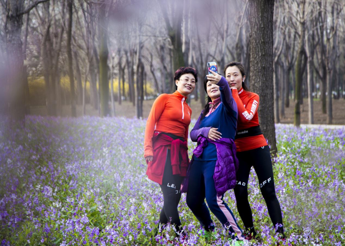 在东营森林乐园,俯身低入二月兰的紫色梦境,东营的莫奈花园,可能就在这里。沿小道步行向前,抬头还可以看到簇簇粉白樱花和杏花。