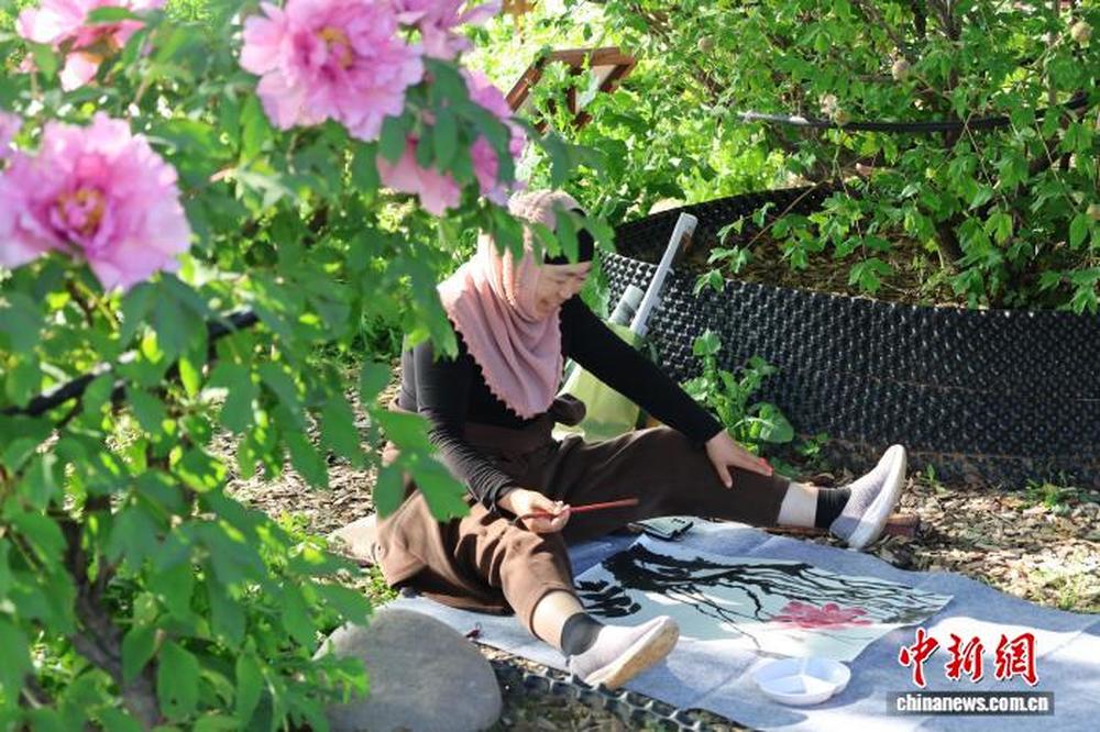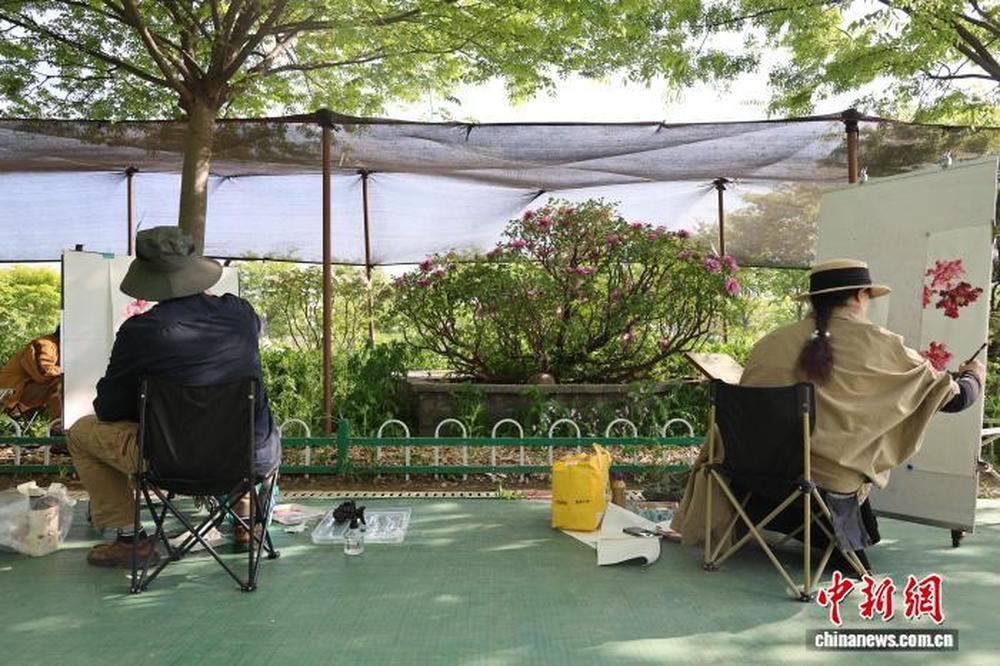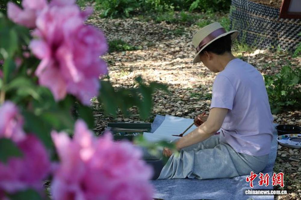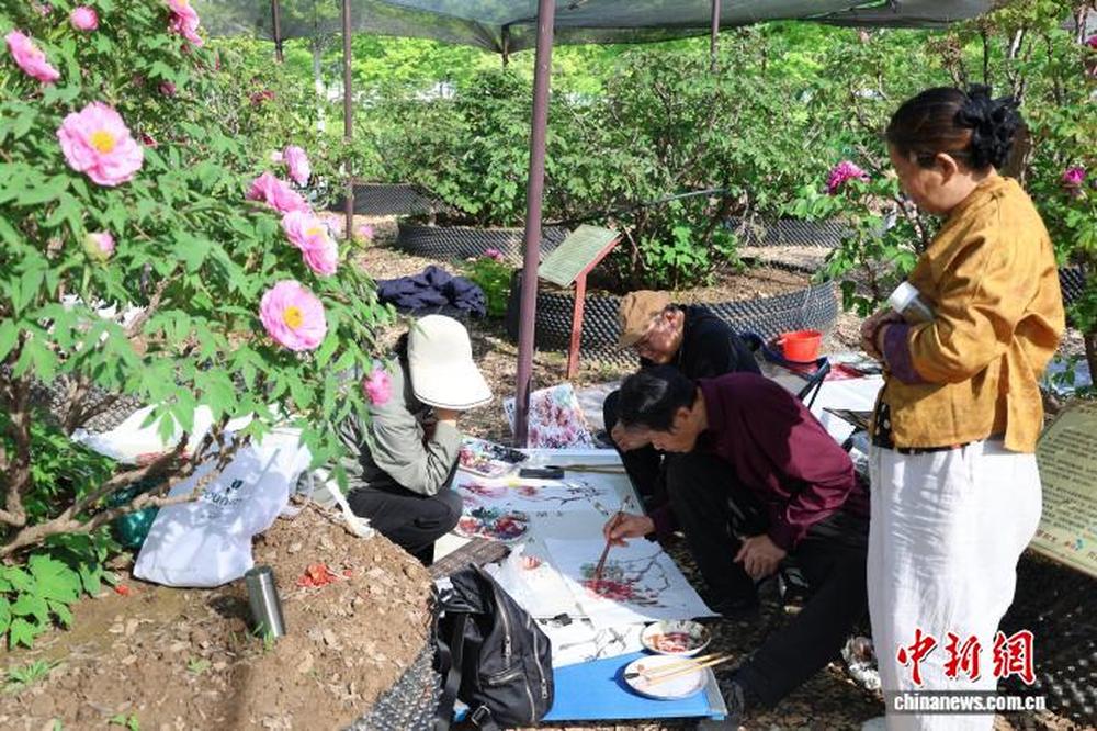 4月10日,位于山东菏泽鲁西新区的菏泽牡丹园,各色牡丹争奇斗艳,吸引画师写生。