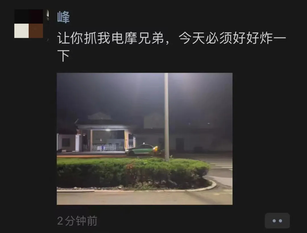 7月22日晚11:00左右,接到群众举报,一位网名叫@峰的网民 在微信朋友圈公开喊话挑衅称“让你抓我电摩兄弟,今天必须好好炸一下”。图片中的场景正是威海乳山交警大队门口。