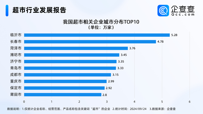具体到各城市的超市企业数量,临沂现存5.28万家超市相关企业,居全国首位。长春、菏泽分别现存4.78万家、3.76万家超市相关企业,居全国前三。此后是潍坊、济宁、青岛等地。值得注意的是,超市相关企业数量最多的10个城市中,有5 个城市位于山东省。
