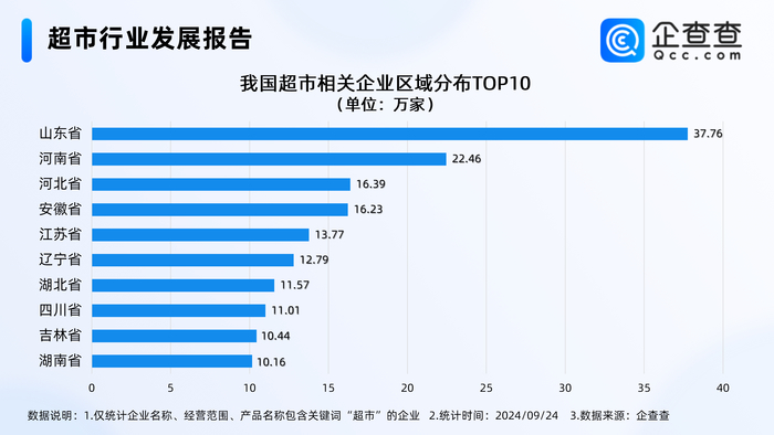 从区域来看,山东现存37.76万家超市相关企业,独占鳌头,稳居全国首位。河南、河北分别现存22.46万家、16.39万家,居全国前三。此后是安徽、江苏、辽宁等地。
