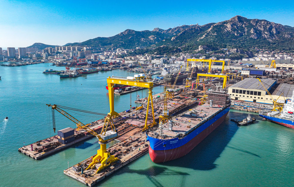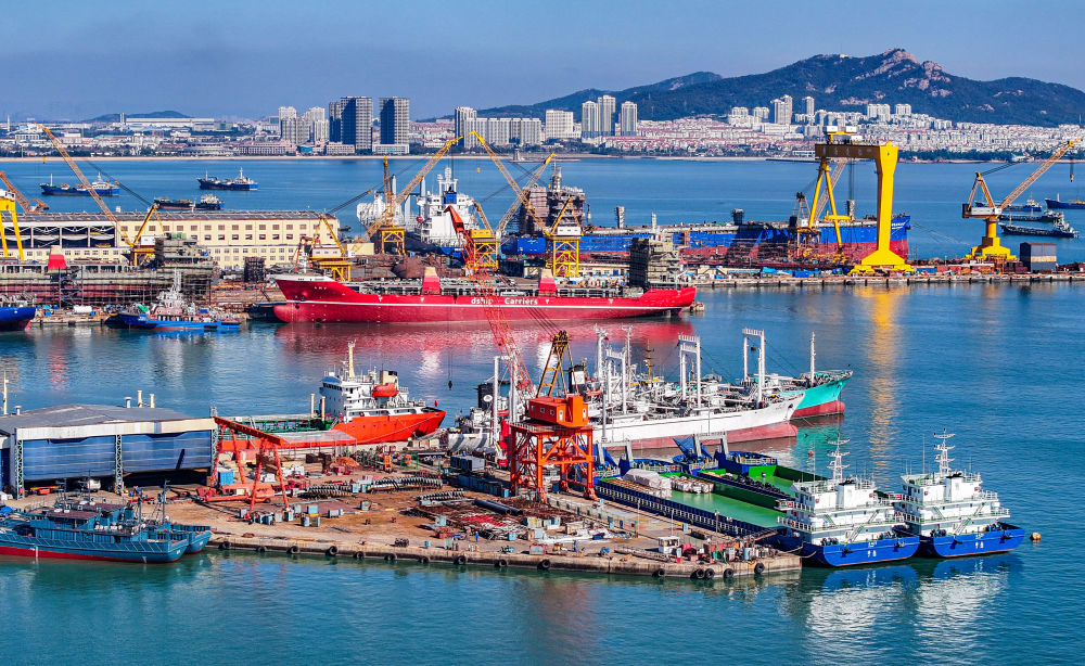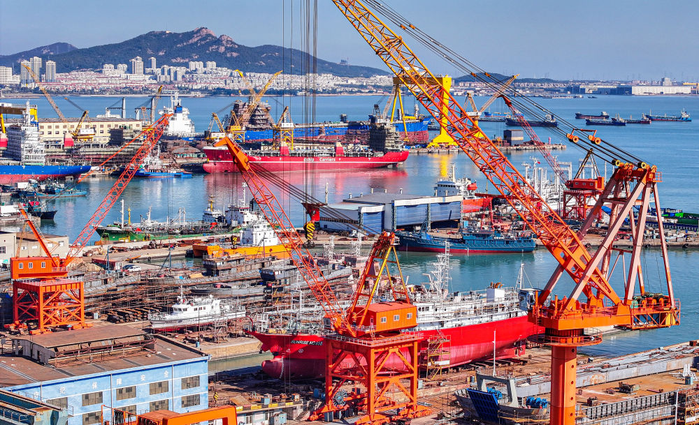 近年来,山东省荣成市大力培育发展修造船产业。在石岛管理区海工装备产业基地船坞内,工人们抓紧建造各类大型船舶,呈现一派繁忙景象。