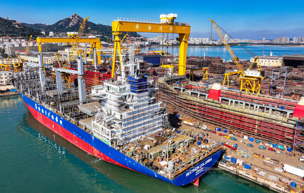 以上图片:2024年10月29日,山东省荣成市石岛管理区海工装备产业基地船坞内,工人在建造大型船舶。(无人机照片)CICPHOTO/李信君 摄