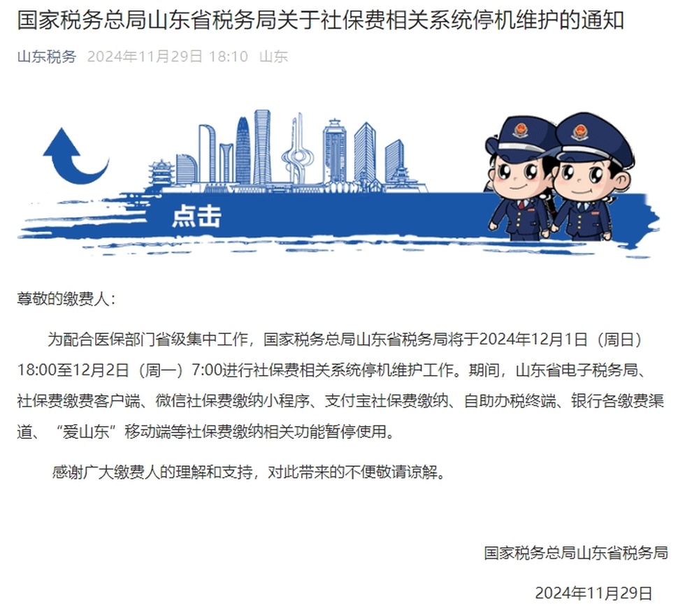 11月29日,国家税务总局山东省税务局发布关于社保费相关系统停机维护的通知: