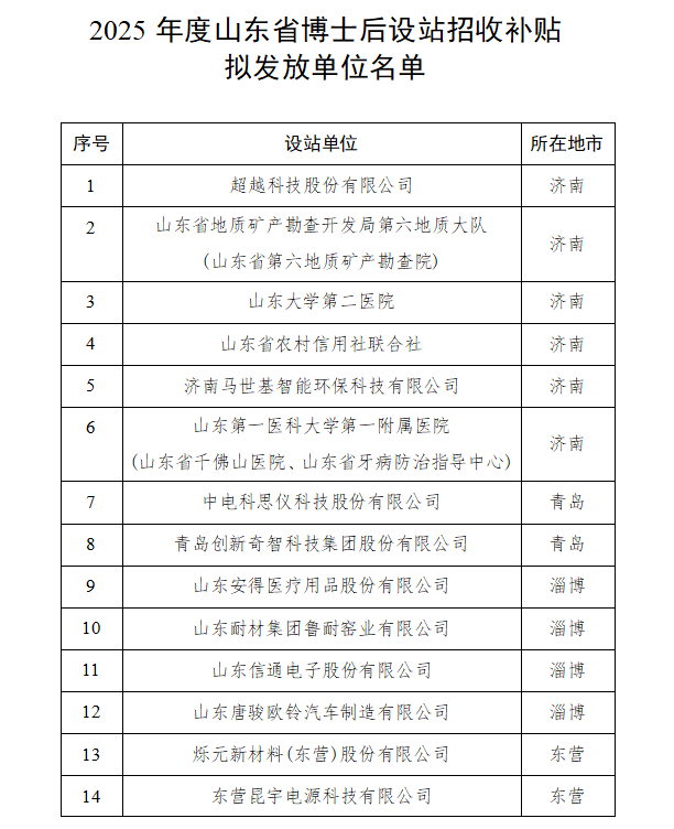 5月14日,新黄河记者从山东省人力资源和社会保障厅了解到,根据《山东省博士后资助项目及经费管理办法》(鲁人社规〔2018〕21号)等有关要求,确定2025年度山东省博士后设站招收补贴拟发放单位41家(拟发放单位名单见附件)。为进一步增强工作透明度,广泛征求意见,接受社会监督,决定对拟补贴单位予以公示,公示期为5个工作日(5月14日—5月20日)。公示期内如有异议,可向省人力资源社会保障厅实名反映。个人反映请署真实姓名及联系方式,单位反映请加盖公章。