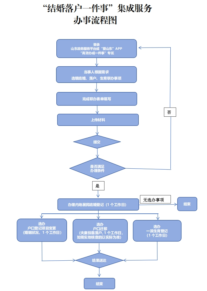(一)线上办理。当事人可以直接通过登录山东政务服务平台(http://www.shandong.gov.cn/col/col94091/)“高效办成一件事”专区或登录“爱山东”APP平台“高效办成一件事”专区进入“结婚落户一件事”主题集成服务模块,进行结婚登记网上预约和户口登记项目变更(婚姻状况)、户口迁移(夫妻投靠落户)、生育登记的在线申请。