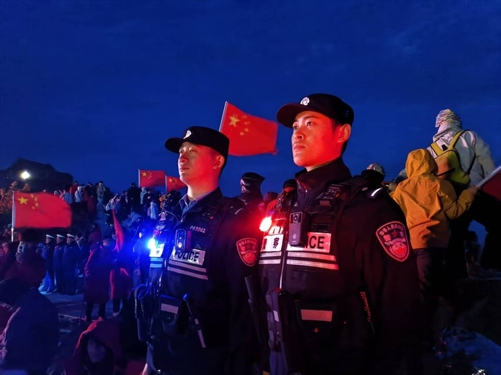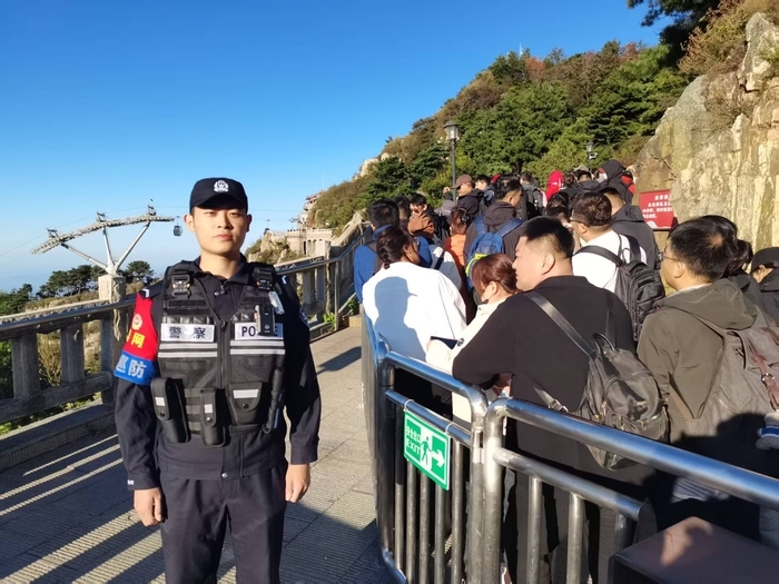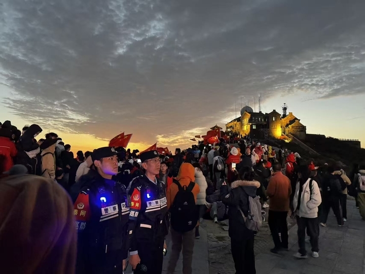 这是丁芸珠第一次直面大客流。攥紧对讲机的手微微用力,他学着师傅的模样,穿梭在人群中分流疏导、提醒安全、解答路线问询。“看到密密麻麻的游客,心里忍不住打鼓,但各部门协作得特别顺,慢慢就放松下来了。”丁芸珠说,当清晨第一缕霞光冲破云海,与游客手中的红旗相映成趣,欢呼声“祖国我爱你”在山间回荡时,他忽然懂了“国泰民安”不是书本里的抽象词——它印在自己“大巡防”袖标上,也映在游客眼中暖融融的晨曦里。