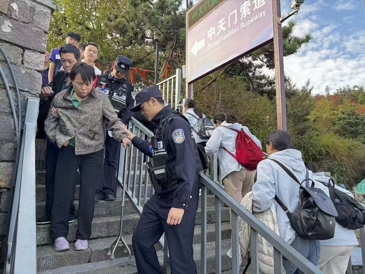 从午后到傍晚,岱顶迎来下山高峰。从未了轩广场到索道站入口前,游客排起的长队绕了好几圈。丁芸珠和同事们全员在岗,从维持秩序到解答“哪条路下山更快”“行李寄存处在哪”,他的嗓子很快哑了,只能靠喝水缓解;手臂挥久了发酸,就趁游客不注意悄悄甩一甩。“看着队伍有序往下走,突然觉得‘国泰民安’不是凭空来的,就像拧螺丝,得一环扣一环、一分力接一分力,才能拼出来。”