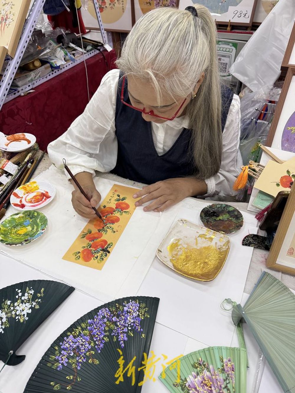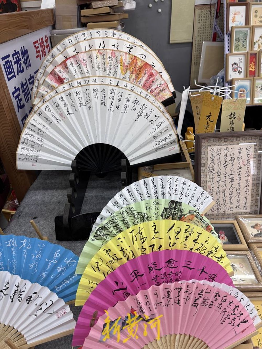 在陈先生旁边的摊位,是李秀荣的国画摊位,陈先生打趣道,“我们俩在这儿摆摊快两年了,她的画配我的字,游客常说‘一套带走才完整’。”记者看到李秀荣正低头给折扇上的花朵调颜料,画出的花瓣层次分明,在折扇旁摆着的成品画里,既有“柿柿如意”的中秋主题,也有“好运连连”的设计,色彩鲜而不艳,透着雅致。