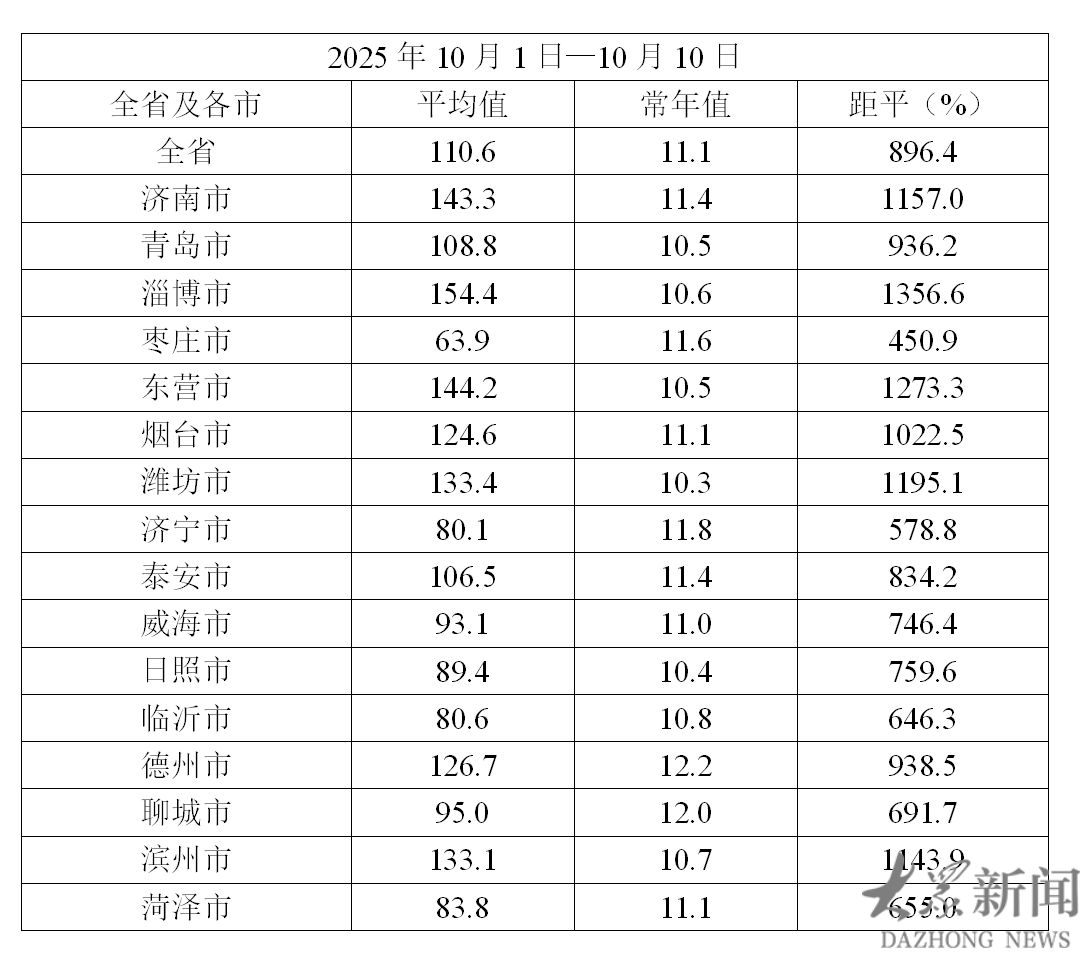 10月的数据更为令人惊叹。根据山东省气候中心最新统计,10月以来(10月1日—10月10日)全省平均降水量为100.6毫米,较常年偏多896.4%,为1951年以来历史同期最多值。全省各市均偏多,其中,淄博、东营、潍坊、济南、滨州、烟台6市较常年同期偏多10倍以上。