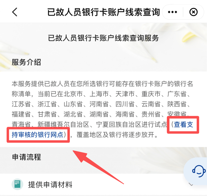 查询人在云闪付APP首页搜索框内输入“已故人员银行卡账户线索查询”,点击进入小程序首页,可查阅服务介绍及目前支持受理查询业务的银行网点。