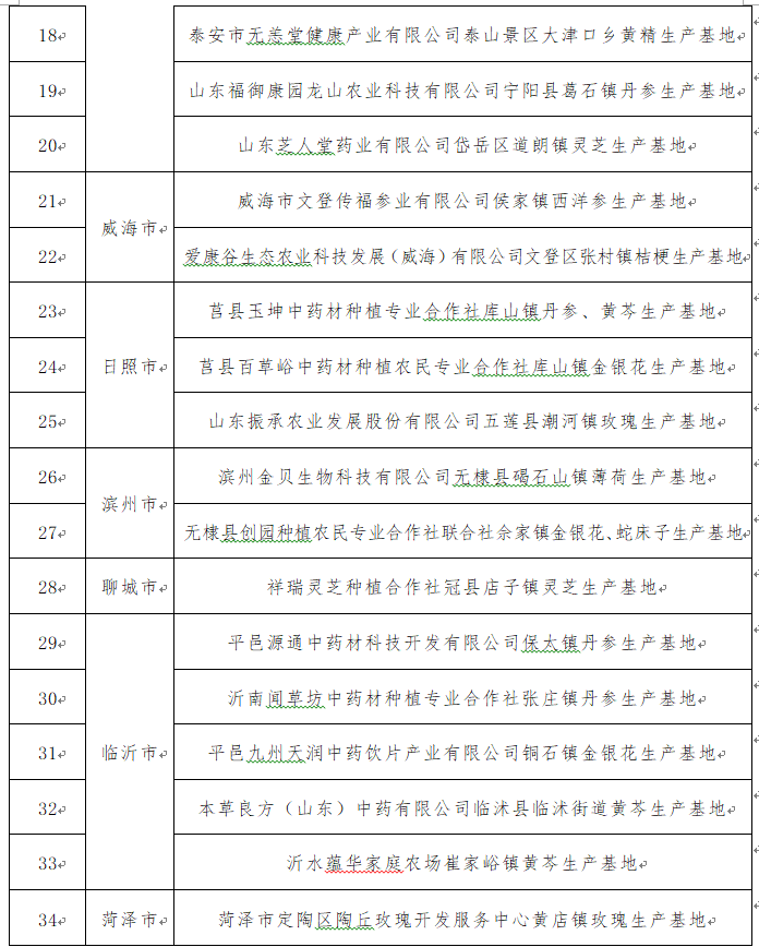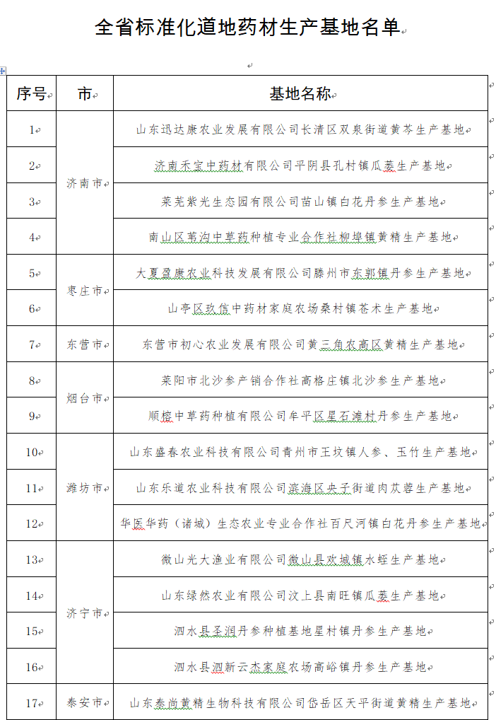 为贯彻落实省政府部署要求,加快建设一批生态环境良好、生产管理规范、示范带动能力强的标准化道地药材生产基地,引领带动全省中药材标准化生产水平不断提升,根据《山东省中药材标准化生产基地建设技术要点》,经主体申报、县级初审、市级推荐、省级实地考察和审核,确定山东迅达康农业发展有限公司长清区双泉街道黄芩生产基地等34家基地为全省标准化道地药材生产基地。