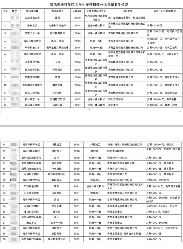 记者从该学院2025年招生简章了解到,学院下设的智能制造学院等六个二级学院均开设大学生技师班,一共招生220人,招生要求起点学历为专科(含高级技工)及以上,培养层次为预备技师,学制2年。此外,记者从青岛市技师学院了解到,其大学生技师班部分优秀毕业生的就职单位、薪资及职业发展情况都比较理想,不少毕业生月薪超过万元。