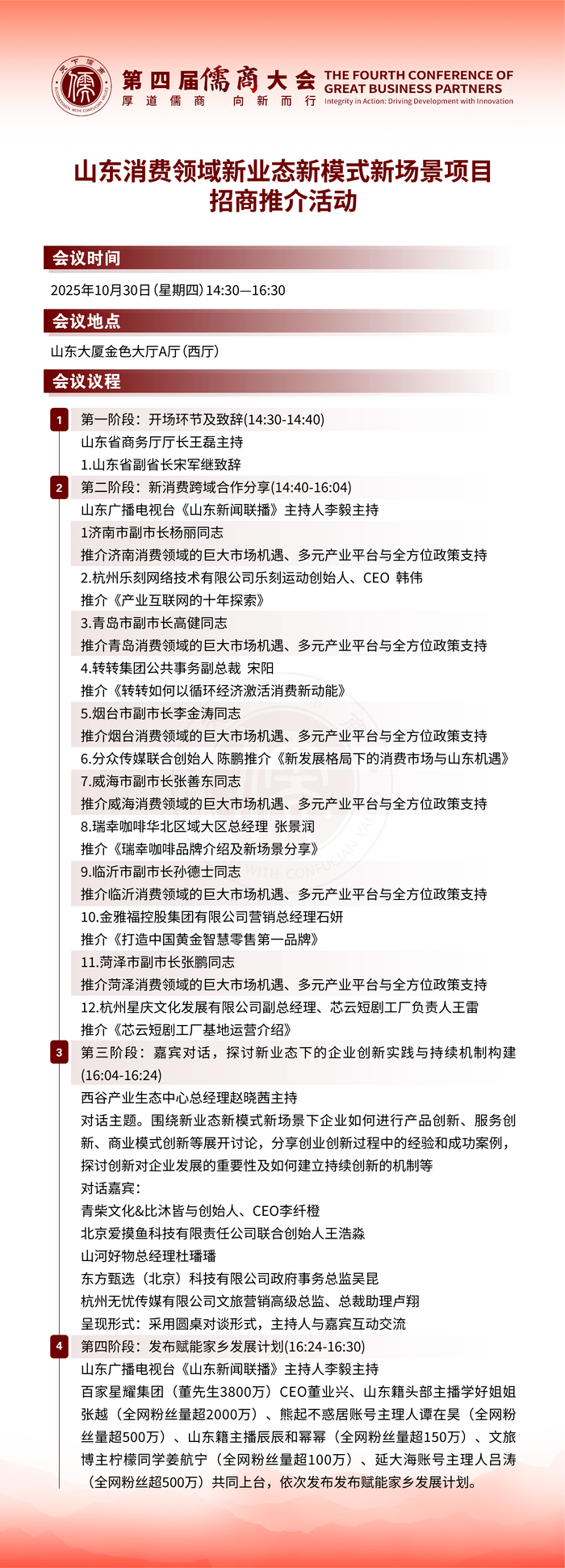 10月30日14:30,山东消费领域新业态新模式新场景项目招商推介活动,将在山东大厦金色大厅A厅(西厅)举行。