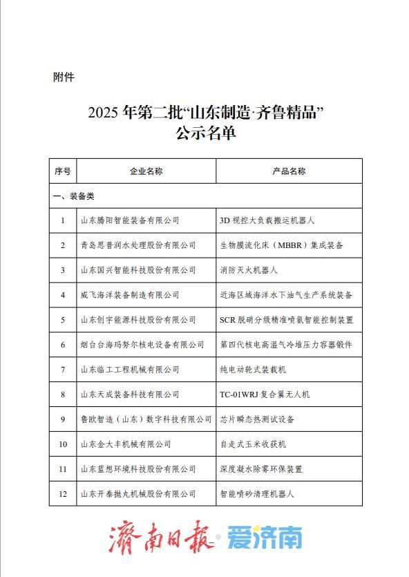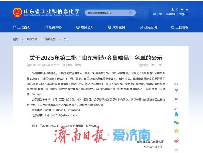 通知称,为扎实推进品牌建设,不断提高产业竞争力,助力“好客山东 好品山东”品牌建设,根据《“山东制造”品牌提升行动方案》(鲁工信技〔2022〕214号)要求,省工业和信息化厅联合山东广播电视台、省质量管理协会组织开展了2025年第二批“山东制造·齐鲁精品”遴选工作。经企业自愿申报、各市初审推荐、专家论证等程序,拟确定海信视像科技股份有限公司“RGB三维控色背光电视”等40项产品为2025年第二批“山东制造·齐鲁精品”。现将名单予以公示。公示期为2025年12月1日至12月5日,共5个工作日。公示期间如对公示对象有异议,请以书面方式反馈省工业和信息化厅,个人反映请署真实姓名及联系方式,单位反映请加盖公章。联系电话:0531-51782609,0531-51782608。电子邮箱:kejichu2019@shandong.cn