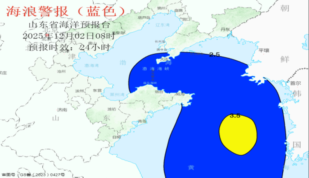 受冷空气影响,预计2日夜间,渤海将出现2.5米到3.2米的大浪,黄海北部和中部将出现3.0米到4.0米的大浪到巨浪。