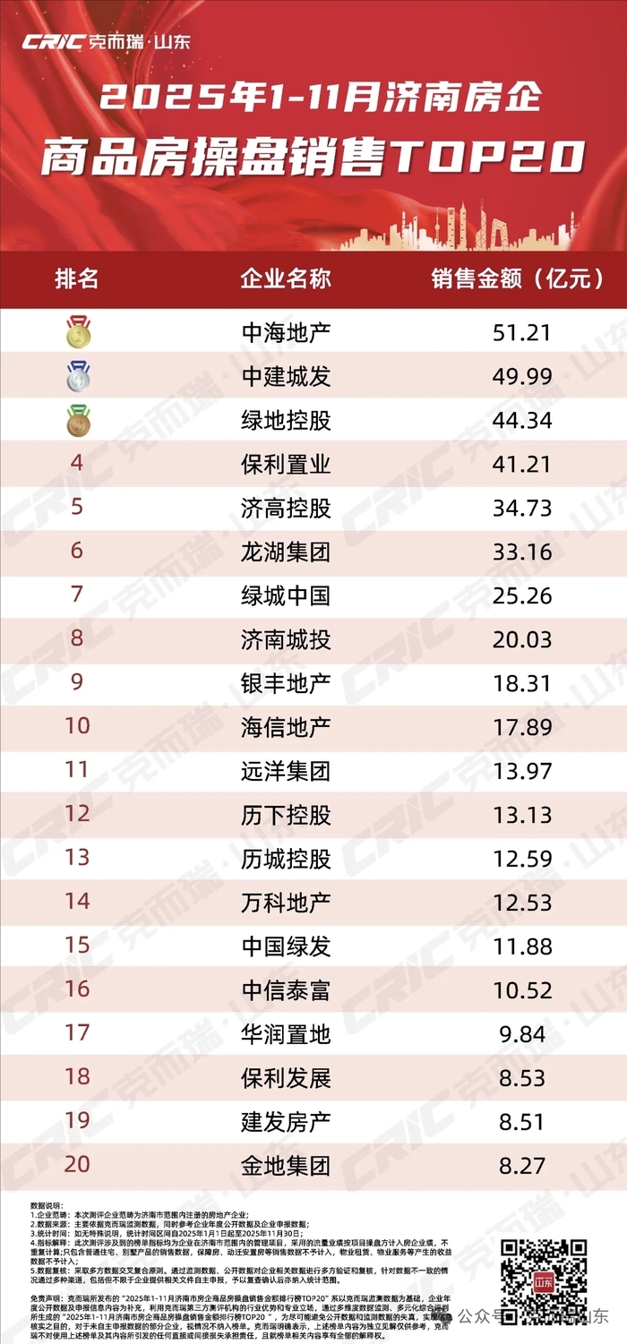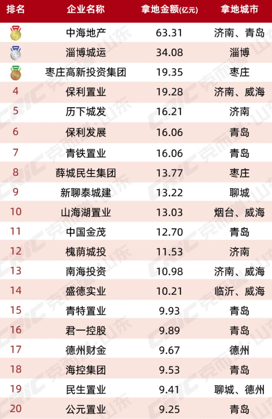 房地产大数据平台克而瑞日前发布的2025年1—11月山东房企拿地排行榜显示,中海地产(63.31亿元)、淄博城运(34.08亿元)、枣庄高新投资集团(19.35亿元)位列房企拿地金额榜前三名。山东房企新增土储排行榜方面,淄博城运(112.97万㎡)、山海湖置业(82.81万㎡)、慧聪置业(54.99万㎡)位列房企新增土储榜前三名。
