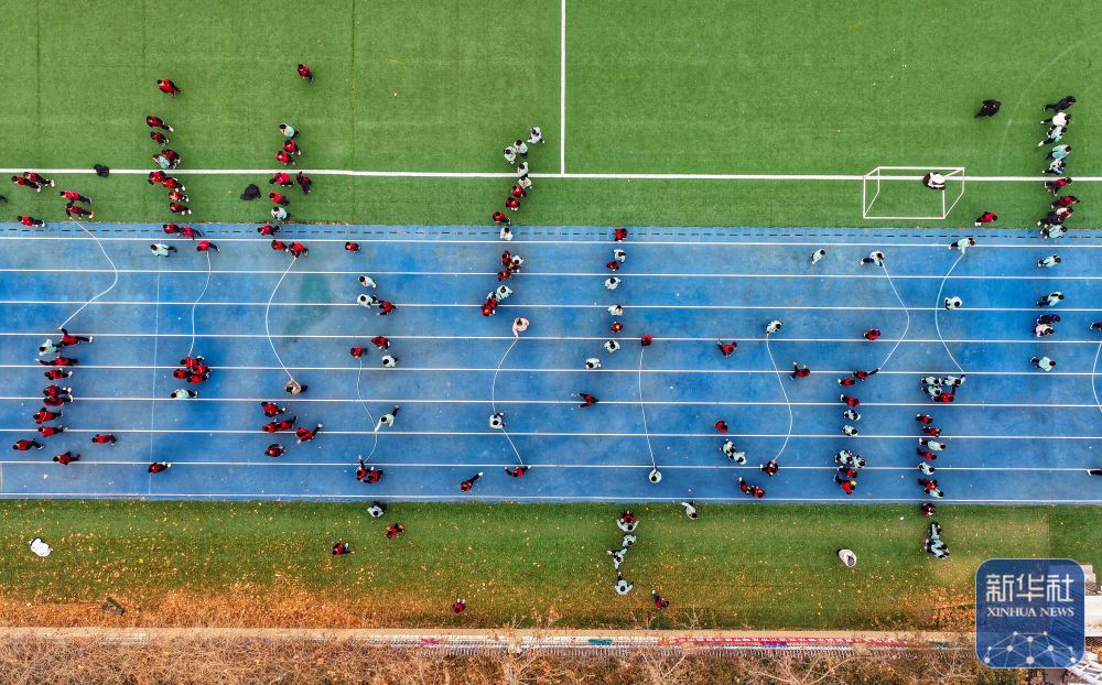 12月19日,在山东省乐陵市第一实验小学,学生们在操场上开展体育活动(无人机照片)。新华社发(马志勇摄)