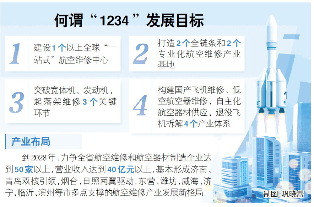 省交通运输厅副厅长廉波介绍,“1234”发展目标中的“1”是建设1个以上全球“一站式”航空维修中心,“2”是打造2个全链条和2个专业化航空维修产业基地,“3”是突破宽体机、发动机、起落架维修3个关键环节,“4”是构建国产飞机维修、低空航空器维修、自主化航空器材供应、退役飞机拆解4个产业体系,力争全省航空维修和航空器材制造企业达到50家以上,营业收入达到40亿元以上,基本形成济南、青岛双核引领,烟台、日照两翼驱动,东营、潍坊、威海、济宁、临沂、滨州等市多点支撑的航空维修产业发展新格局。为实现上述目标,《行动方案》部署实施四大重点行动,推进12项关键工作。推进措施中,明确建立对口服务机制,营造一流发展环境,强化财税支持引导,加快高端人才集聚,为航空维修产业高质量发展提供强力支撑。
