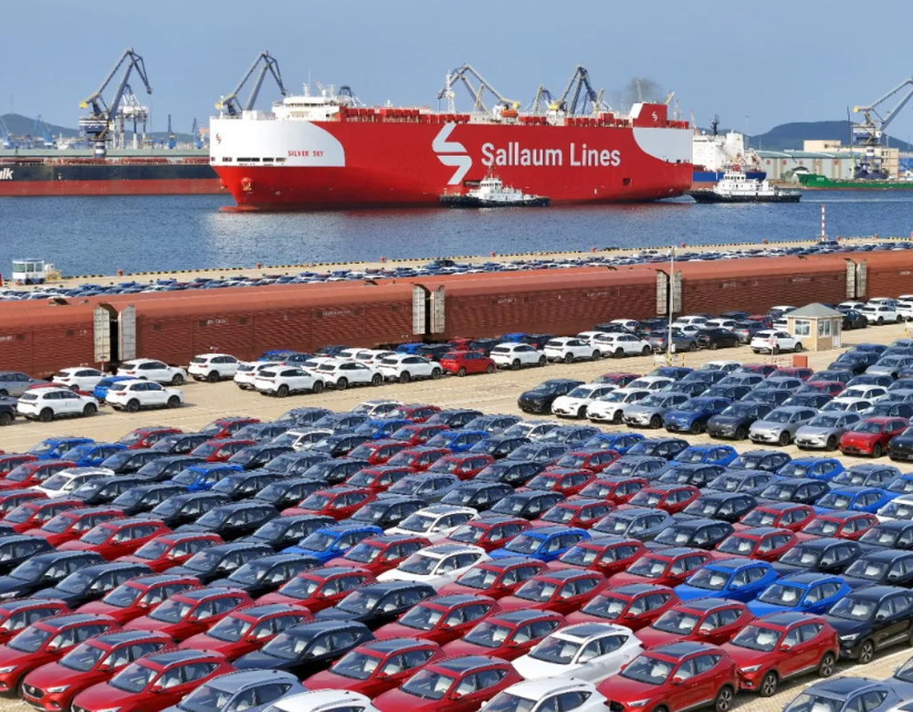 国产汽车在山东港口烟台港集结等待装船出口。唐克摄(新华社发)