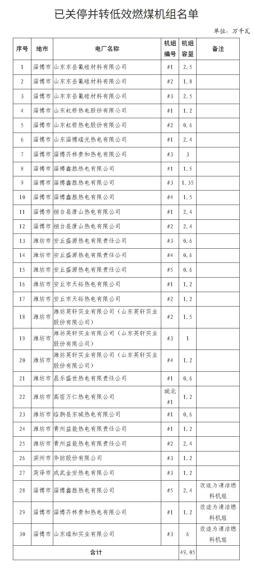 关于淄博、潍坊、滨州、菏泽市已关停并转低效燃煤机组名单的公示