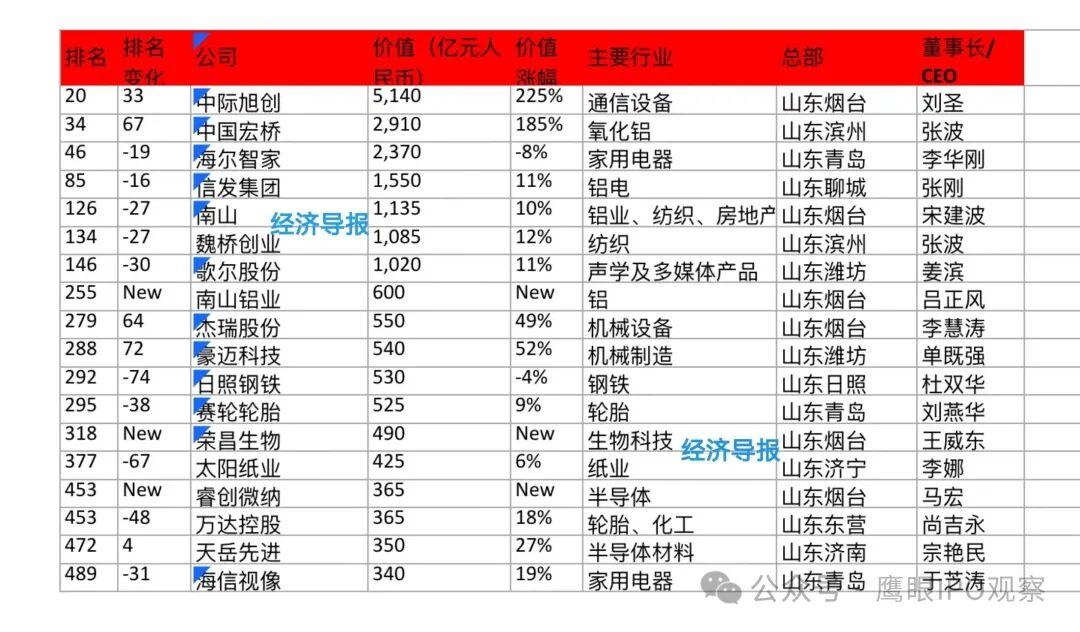 相比之下,去年山东排名最高的海尔智家,今年位列全国第46位,企业价值为2370亿元,排名有所回落,但仍是山东制造业和消费电子领域的重要代表。