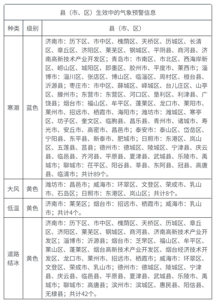 6日20时,山东省气象台海上大风黄色预警生效中;济南市、青岛市、淄博市、枣庄市、东营市、烟台市、潍坊市、泰安市、日照市、德州市、聊城市寒潮蓝色预警生效中。威海市大风黄色预警生效中。济南市、烟台市、威海市、德州市道路结冰黄色预警生效中。县(市、区)生效中的气象预警信息如下: