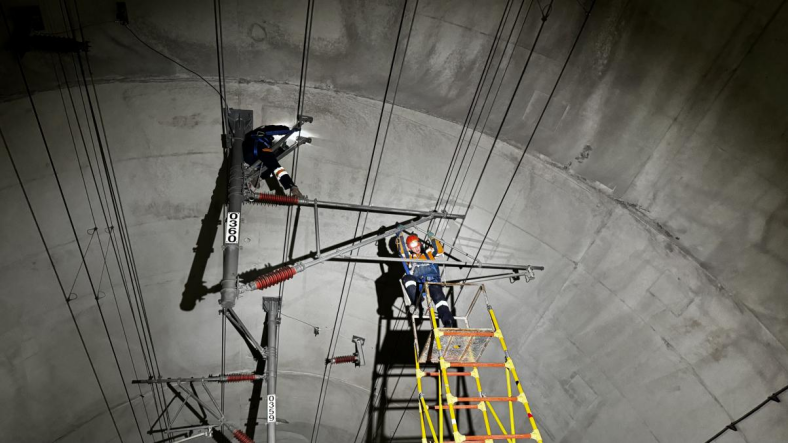 青荣城际铁路孟家疃隧道内,头灯光束划破黑暗,映出拱顶上一群“蜘蛛人”的身影。他们系紧安全带,在距地面6米多高的接触网设备间攀爬检修,每一步都关乎高铁列车的安全运行。