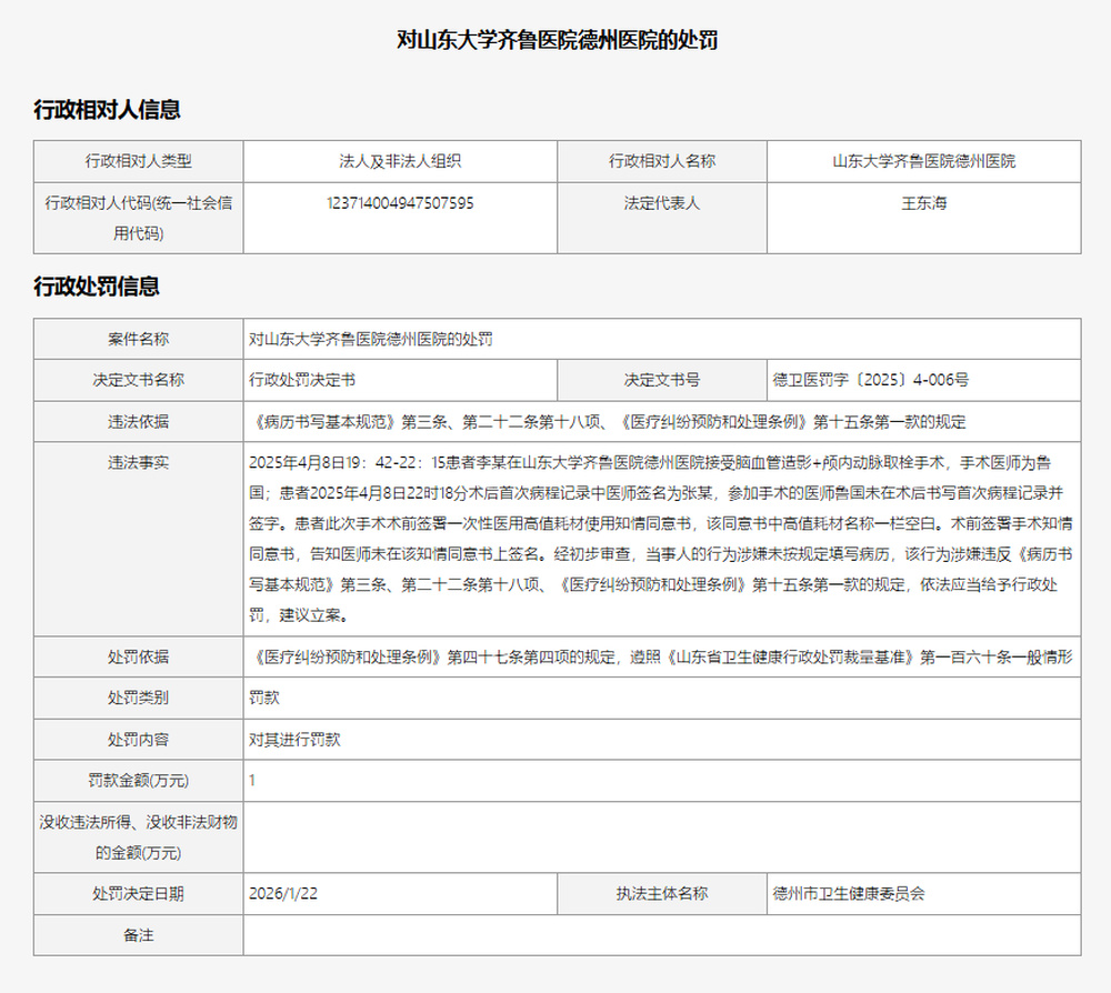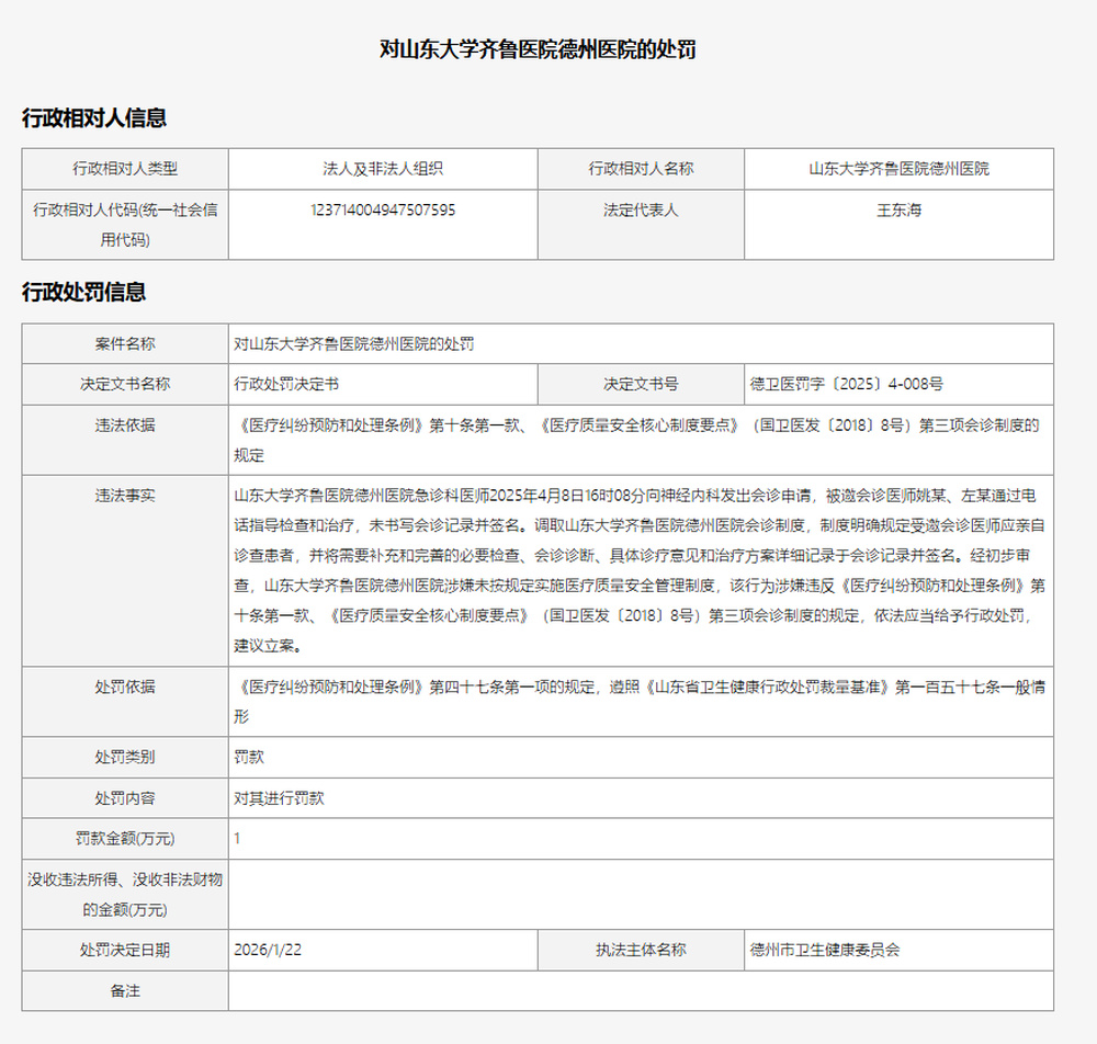 据德州市行政执法信息公示平台,山东大学齐鲁医院德州医院因违反核心医疗制度、病历书写规范被罚。