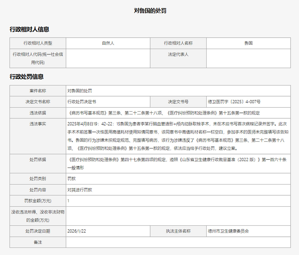 2025年4月8日19:42-22:15鲁国为患者李某行脑血管造影+颅内动脉取栓手术,未在术后书写首次病程记录并签字。此次手术术前签署一次性医用高值耗材使用知情同意书,该同意书中高值耗材名称一栏空白,参加手术的医师未完整填写该告知书。鲁国的行为涉嫌未按规定规范、完整填写病历,该行为涉嫌违反了《病历书写基本规范》第三条、第二十二条第十八项、《医疗纠纷预防和处理条例》第十五条第一款的规定,依法应当给予行政处罚,建议立案。
