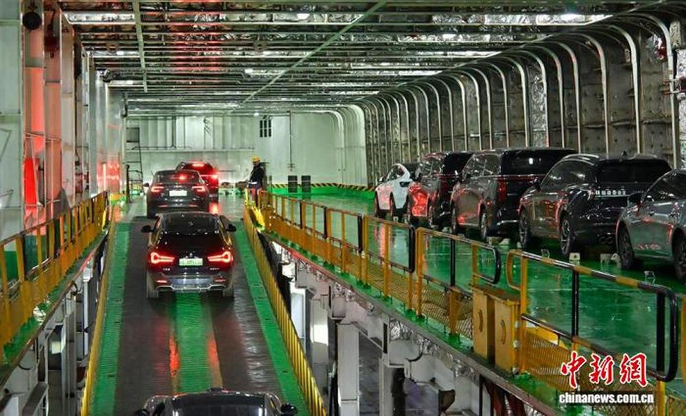 2月13日,烟台港客运码头,新能源汽车驶入“绿安达”轮船舱。中新社记者 王娇妮 摄