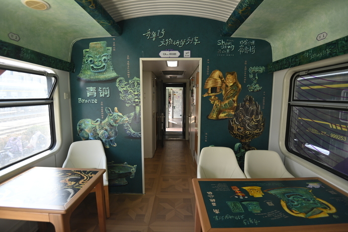 列车由绿皮火车改造而成,贯通山东、河北两省,串联泰安、济南、聊城、邯郸4座国家历史文化名城,是全国首个集文物研学与交通功能于一体的文旅融合创新项目。车上配置青铜、玉、瓷、陶、画像石、建筑、服饰7节文物主题车厢,还特设1节娱乐车厢,包括超大拼罐子、巨型文物拼图、古今文物对对碰、文物涂色及集章打卡等多种互动游戏,好玩又有趣,让大朋友、小朋友一站式嗨玩。