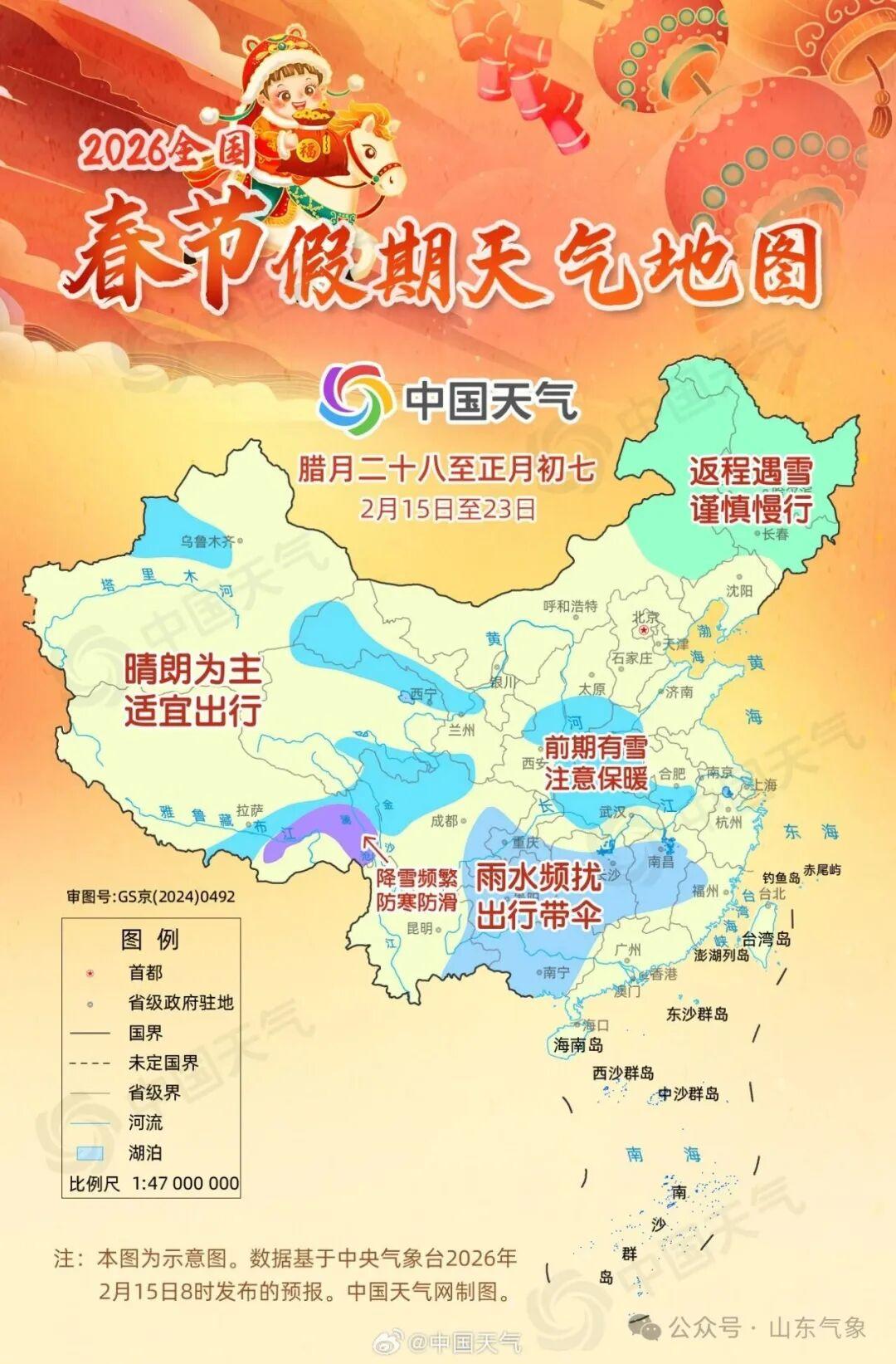 春节假期期间(腊月二十八至正月初七),我国无大范围雨雪冰冻等灾害天气,总体适宜出行。全国大部地区气温较常年同期偏高1至3℃,但气温起伏较大,注意适时增减衣物。