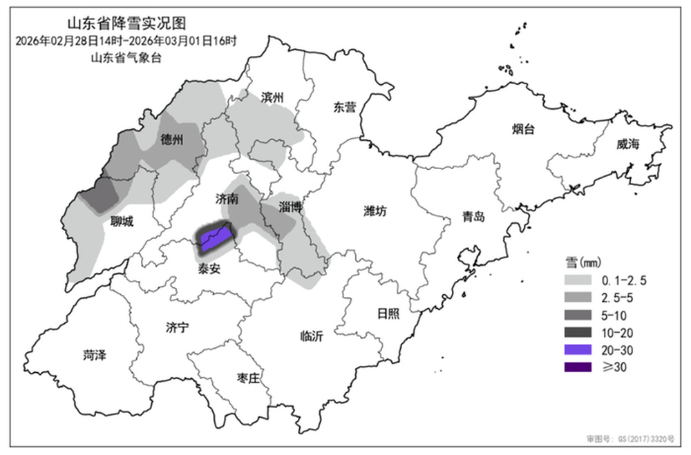从过程降雪量来看,2月28日14时至3月1日16时,全省共有6市、23县(市、区)出现降雪,平均降雪量0.5。各市平均:泰安3.5、德州1.7、聊城1.2、淄博1.1、济南0.7和滨州0.5,其他市无降雪。降雪量前3位的点位是:泰安泰山20.7、聊城临清5.3和德州夏津4.5。其中,泰山降雪量达到大暴雪量级。