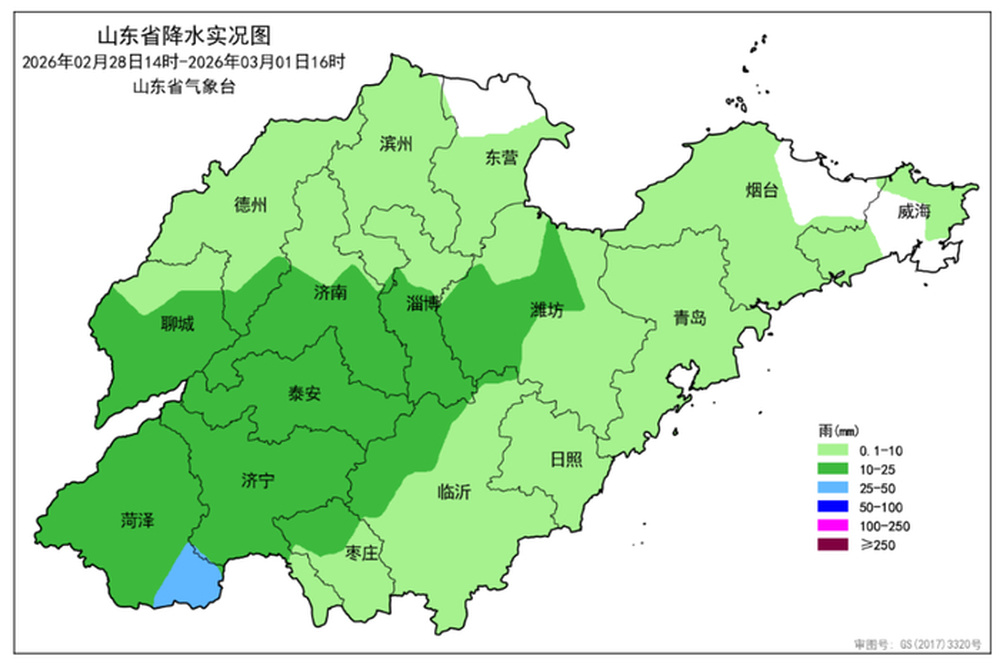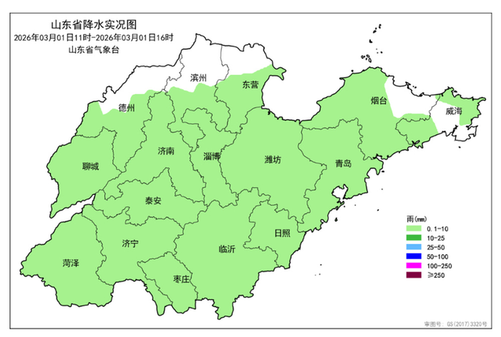 据山东省气象台消息,3月1日11时至1日16时,全省共有16市、108县(市、区)出现降水,平均降水量3.1(毫米,下同),折合水量约4.9亿立方米。各市平均:潍坊5.1、济宁4.5、枣庄4.4、淄博4.4、日照4.3、临沂4.0、泰安4.0、济南3.8、菏泽3.8、青岛3.7、聊城3.5、东营1.5、滨州1.3、德州1.1、烟台0.9和威海0.2。降水量前3位的点位是:济宁微山7.5、青岛黄岛6.7和临沂蒙阴6.4。