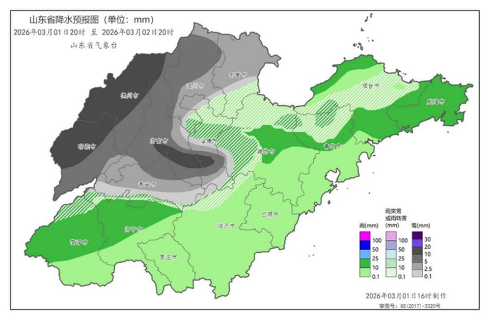 山东省气象台于3月1日16时继续发布道路结冰黄色预警:受气旋影响,预计1日夜间到2日白天,我省将有明显雨雪天气。其中,聊城、德州、滨州、东营、济南、泰安和淄博南部有雨夹雪转中到大雪局部暴雪,积雪深度2~7厘米局部10厘米以上。降雪地区将产生对交通有明显影响的积雪和道路结冰,给交通运输、城市运行、电力设施和设施农业等带来不利影响,请加强防范。