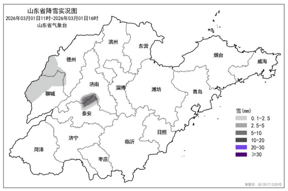 3月1日11时至1日16时,全省共有3市、6县(市、区)出现降雪,平均降雪量0.1。各市平均:泰安0.9和聊城0.5,其他市微量或无降雪。降雪量前3位的点位是:泰安泰山5.6、聊城临清2.2和聊城高唐1.4。