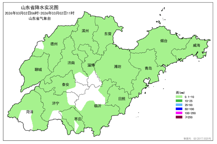 据山东省气象台最新统计,今天(3月2日)6时至11时的5个小时里,全省共有16市、111县(市、区)出现降水,平均降水量2.0(毫米,下同),折合水量约3.1亿立方米。各市平均:威海6.9、烟台5.3、青岛4.9、东营2.9、潍坊2.7、滨州2.2、日照1.9、淄博1.3、济南1.2、德州1.2、聊城0.8、临沂0.6、泰安0.4、枣庄0.3、济宁0.2和菏泽0.1。前3位的是:烟台牟平9.0、烟台市区8.9和威海市区8.5。